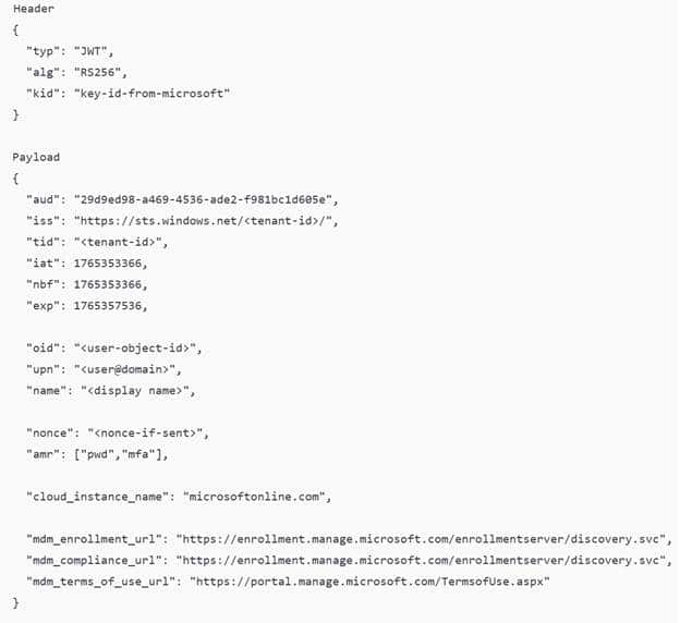 The mdm_enrollment_url claim is the key one. That is how the device learns where it should enroll next. If the token can’t be parsed, OtaDJ can’t extract the URL and can’t proceed to the MDM auth stage. So, the login succeeds, but the next step never starts. The device doesn’t even reach the “request ODJ blob” part, because it dies before enrollment routing can be built. That’s why 80004005 shows up instantly.