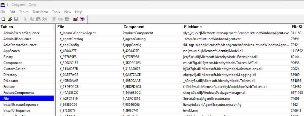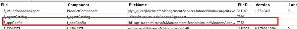 The next step was understanding why only older devices were affected. The answer came from inspecting the IME installer. Opening the MSI in ORCA showed that it includes the IME executable, the IdentityModel libraries, and a single copy of Microsoft.Management.Services.IntuneWindowsAgent.exe.config.