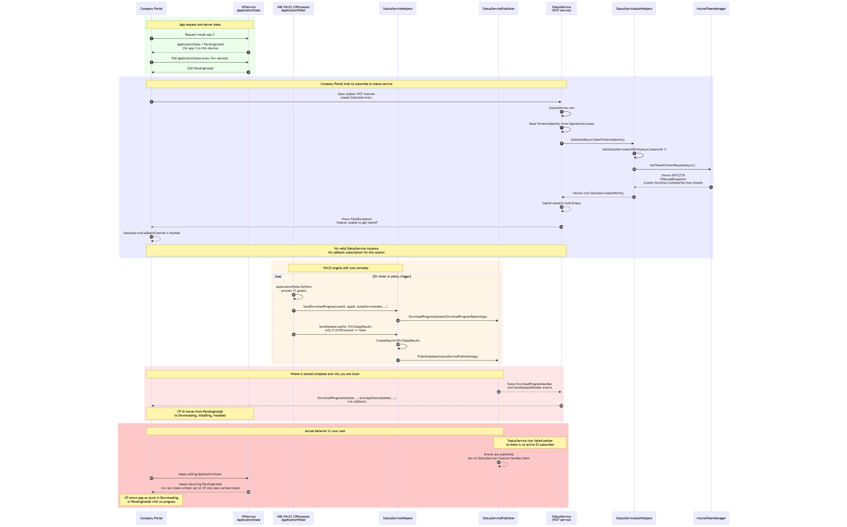 Every step in that chain depends on the IME being able to authenticate the session. If token validation fails, none of the downstream components initialize. The Win32 plugin never starts, the download never begins, and StatusService never comes online. From the outside, it looks like a UI issue in the Company Portal, but nothing is running underneath.