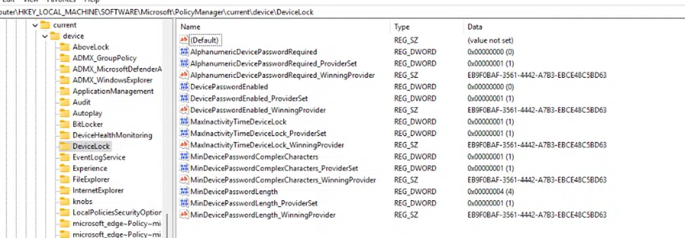 Well, here’s where the wild goose chase begins. We started by checking the usual suspects: Security Baselines, Endpoint security Policies, and device configurations. Everything seemed fine. Nothing out of the ordinary. But then… we noticed something strange on the device itself: registry keys showing up in the PolicyManager\Current\device\DeviceLock path.