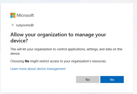 The “Allow your organization to manage your device” prompt is not a standalone Windows dialog. It is part of a web driven authentication flow controlled by Azure AD. The device simply renders what Azure AD instructs it to render based on the configuration it receives. When you disable MDM enrollment during account addition, you are not hiding a prompt.