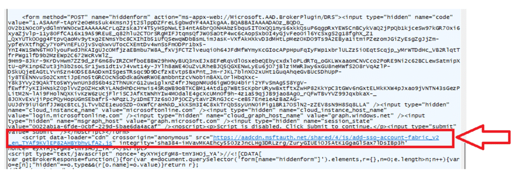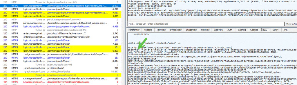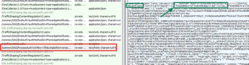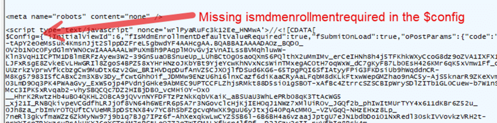 Azure AD always returns the Fabric shell page after authentication. The difference is in what it places inside the $Config parameter. If MDM enrollment is enabled in the tenant and the user is in scope, Azure AD includes values such as fIsMdmEnrollmentRequired in $Config.
