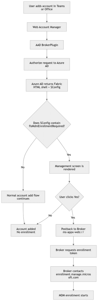 You have probably seen the new option in the Intune portal that lets you disable MDM enrollment when a user adds a work or school account. It looks like a simple switch. Flip it, and the prompt disappears. But what actually changes under the hood? In this post, I am not guessing. I am proving it step by step with a Fiddler trace, showing exactly how the Windows broker and Entra ID decide whether the MDM management prompt is rendered.