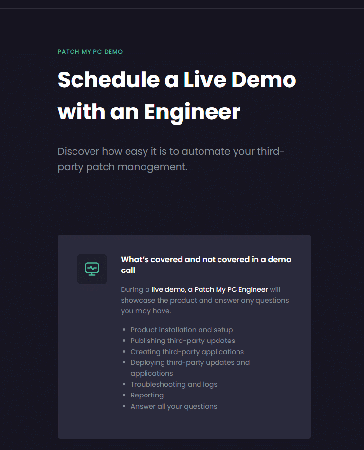 With Patch My PC, you don’t have to rely on workarounds. Packaging, updating, and content management are all automated, saving you time and reducing risk. Book a demo today to see how Patch My PC can simplify your application lifecycle.