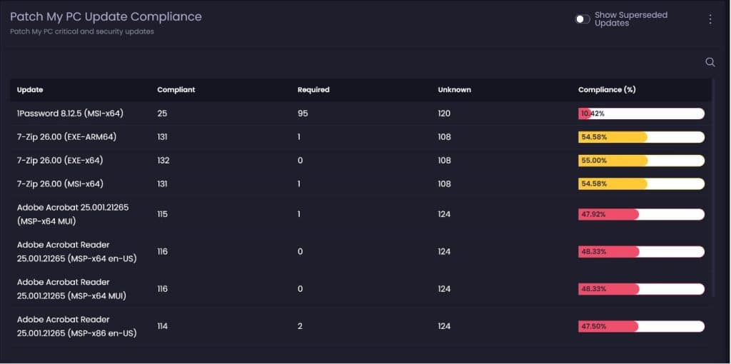 This is the trap: a device can show compliant in Microsoft Intune and still be running outdated third-party applications. Natively Intune provides very little in this space, but even with an integrated 3rd Party app catalog, Intune’s compliance reporting is non-existent.
