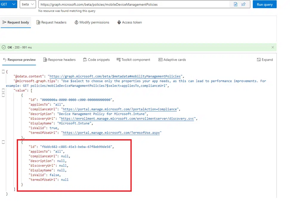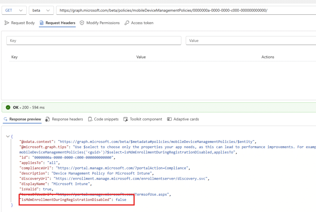While looking back at the blog, we knew exactly what to do. Opening the default MDM policy through Graph, because the Intune portal doesn’t always show you the real picture. And the moment the response came back, one thing jumped out. The policy now contains a property that never appeared in my earlier screenshots.