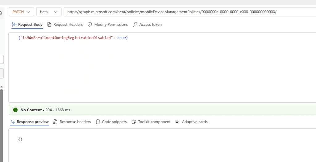 PATCH https://graph.microsoft.com/beta/policies/mobileDeviceManagementPolicies/0000000a-0000-0000-c000-000000000000