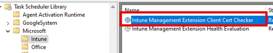 The new shiny Intune Management Extension Client Cert Checker scheduled task is a key component in this process. This new scheduled task runs regularly to check whether the device has a valid MDM client certificate. When first looking at this new task, it seems designed to prevent scenarios in which a device might lose its ability to communicate with Intune due to an invalid or missing certificate.
