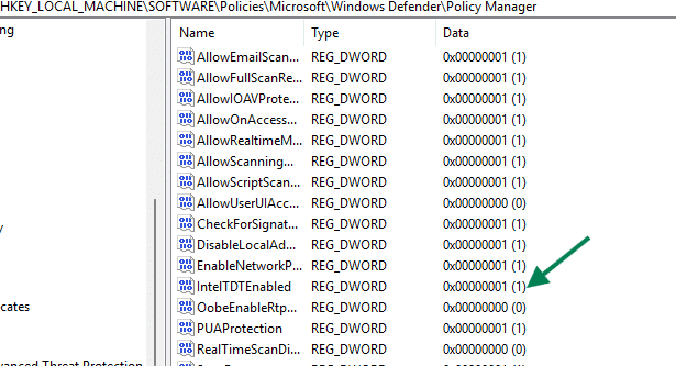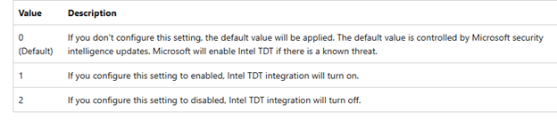 CSP URI: ./Device/Vendor/MSFT/Defender/Configuration/IntelTDTEnabled