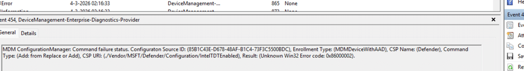 After the February 2026 Windows update, the Defender CSP node IntelTDTEnabled stops working. Intune deployments start failing with error 65000, while the device logs reveal the real cause: 0x86000002, indicating the node is no longer supported. The setting also shows as deprecated when using Set-MpPreference.