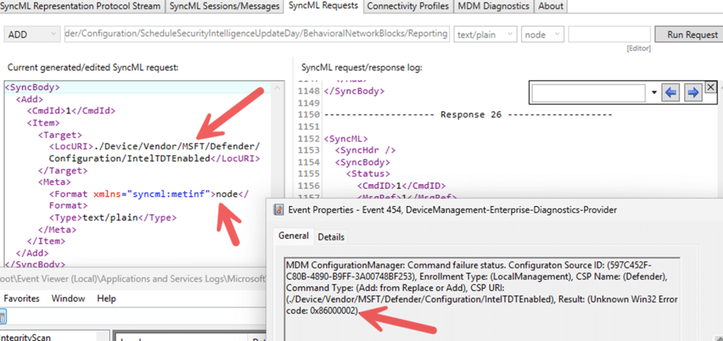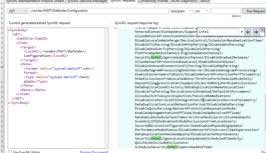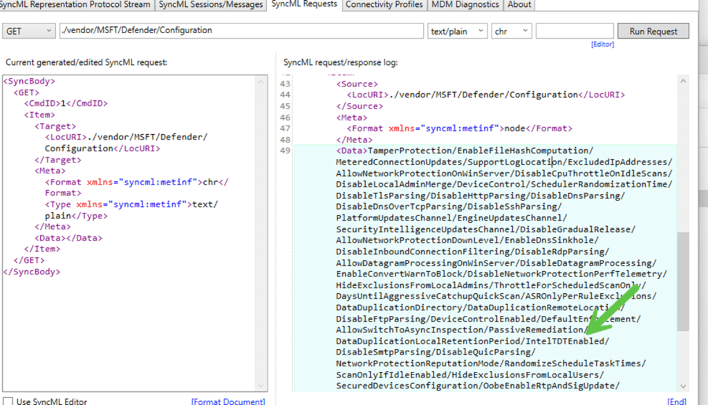 To remove Intune from the equation, the next step was to test the configuration directly through SyncML. Using the local SyncML testing tool, we queried the configuration CSP defender node to find out if the IntelTDT was indeed gone