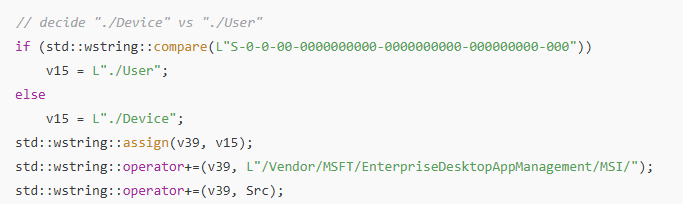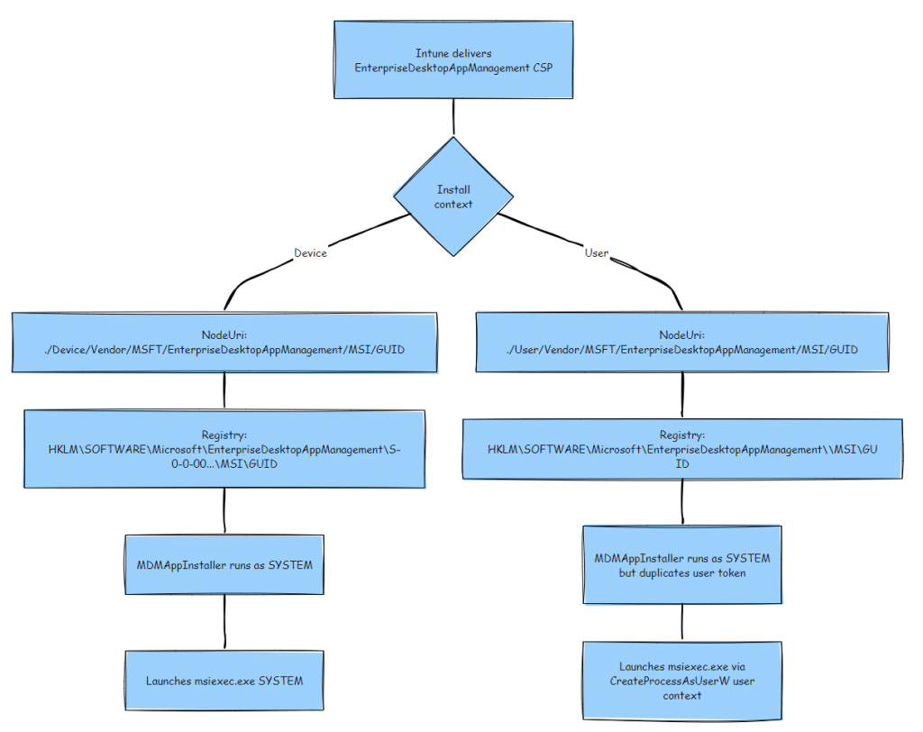 If it’s User, it uses the logged-in user’s real SID. This triggers MDMAppInstaller, which monitors those registry keys for new jobs and starts the install process based on that information.
