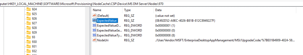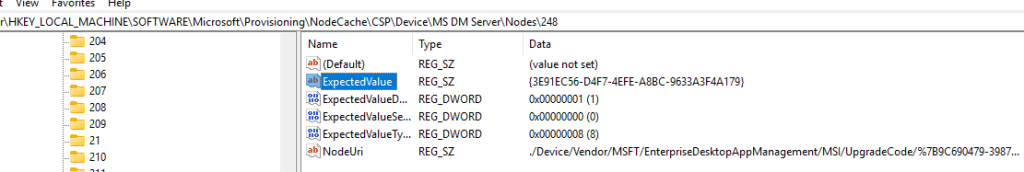 When Intune delivers the policy, the CSP node is written under: HKLM\SOFTWARE\Microsoft\Provisioning\NodeCache\CSP\Device\MS DM Server\Nodes\<PolicyID>\NodeUri. That value points to either: ./Device/Vendor/MSFT/EnterpriseDesktopAppManagement/MSI/{ProductGUID}
