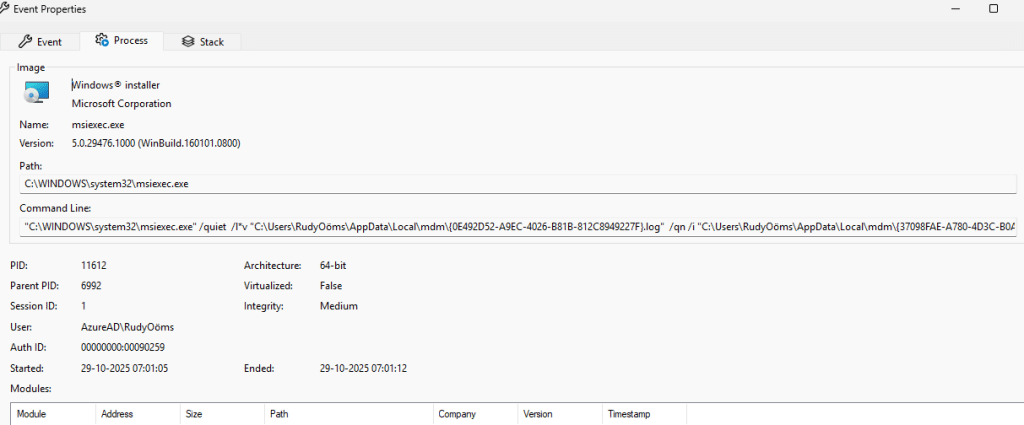 MDMAppInstaller.exe → msiexec.exe (User: AzureAD\<username>)