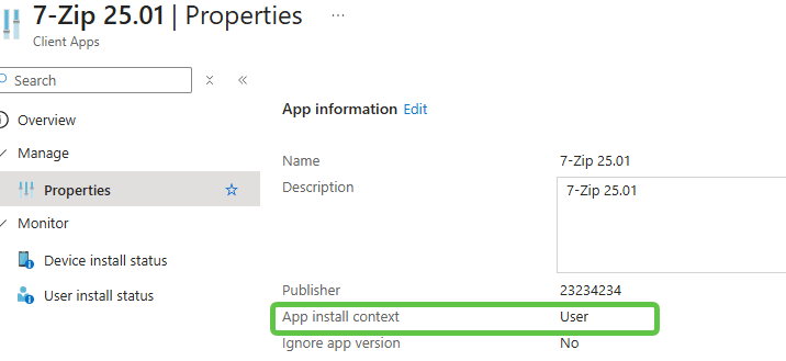 That didn’t make sense. The first test was with Zoom, which supports both per-user and per-machine installs. Normally, when you run the installer manually without elevation, it installs in the user’s profile. But when Intune pushed it as an LOB app with Install behavior: User, it went straight into Program Files. At first, it seemed like a packaging issue. Until we tested another one… 7-Zip. Same result.