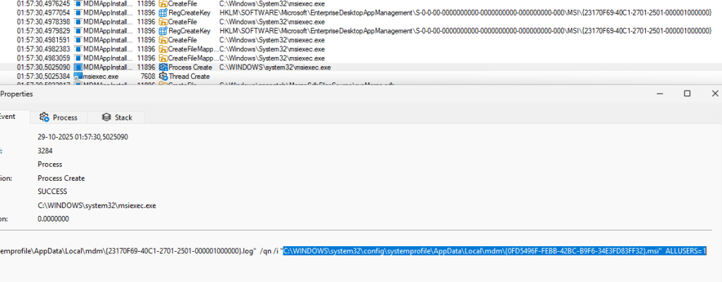 But that process was still spawned by SYSTEM through MDMAppInstaller.exe.