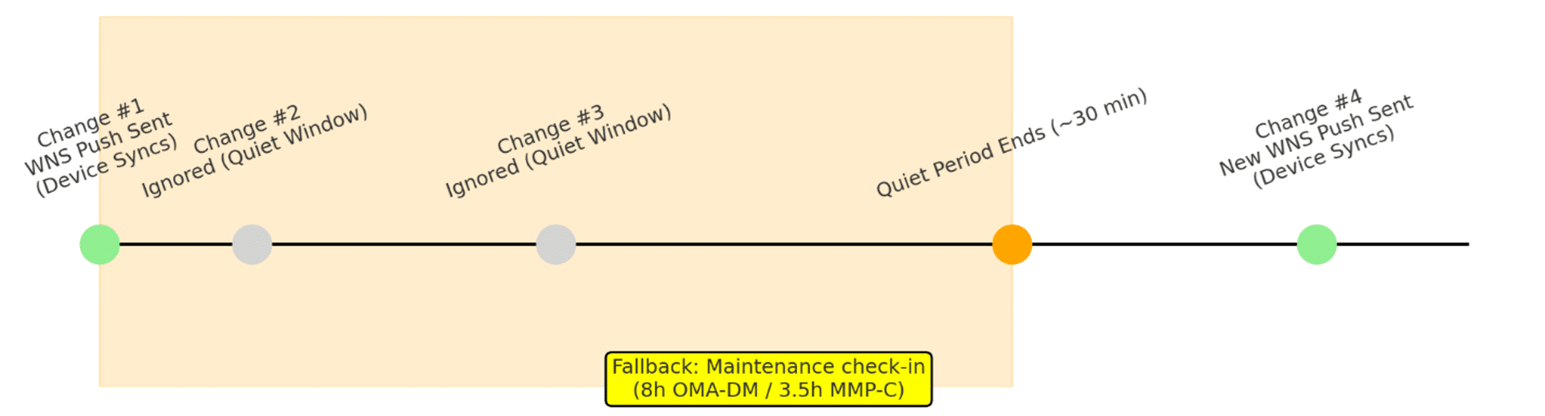 - Once the ~30-minute quiet period has passed, the next change triggers another WNS push.
