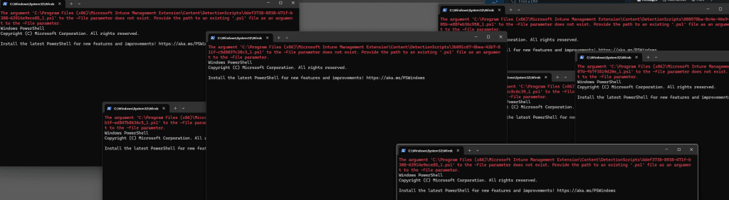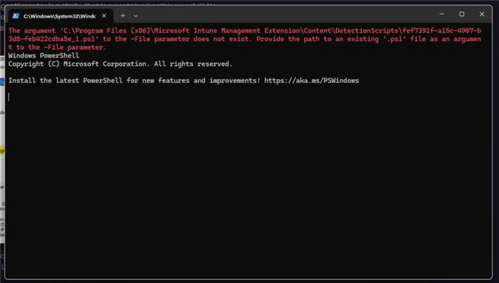 That’s what the user noticed. Not Intune. Not the logs. Just a PowerShell Window for a second, before it disappeared with the message: the -file parameter does not exist