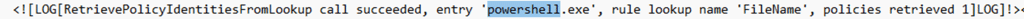 RetrievePolicyIdentitiesFromLookup call succeeded, entry ‘powershell.exe’, rule lookup name ‘FileName’, policies retrieved 1