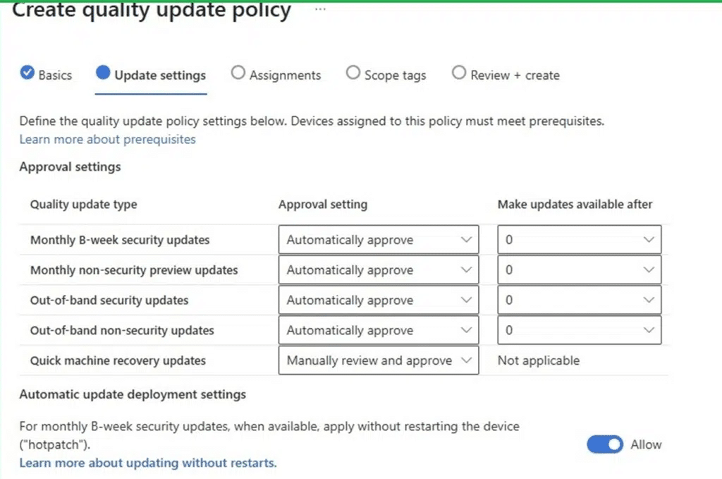 And now the story extends even further. Microsoft is moving to formalise update-categories in Intune with the new Quality Update Management Policies wizard. In that wizard, QMR appears alongside regular monthly security updates, non-security previews, and out-of-band updates. That means the same engine we examined in WinRE, and the management blade we observed via WRR, are now being framed inside an inaugural policy structure that allows assignment, approval, monitoring, and categorisation of QMR updates.