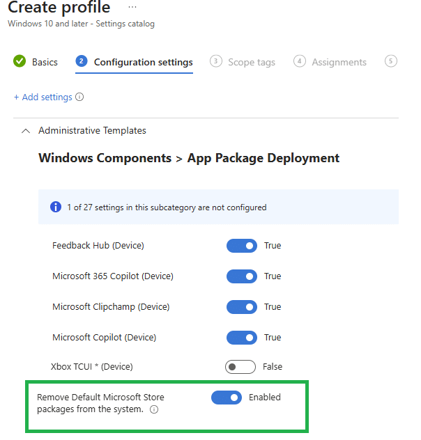 Besides having the good old legacy GPO option to configure this feature to remove default microsoft Store Packages, we can also configure a settings catalog to configure the same thing.