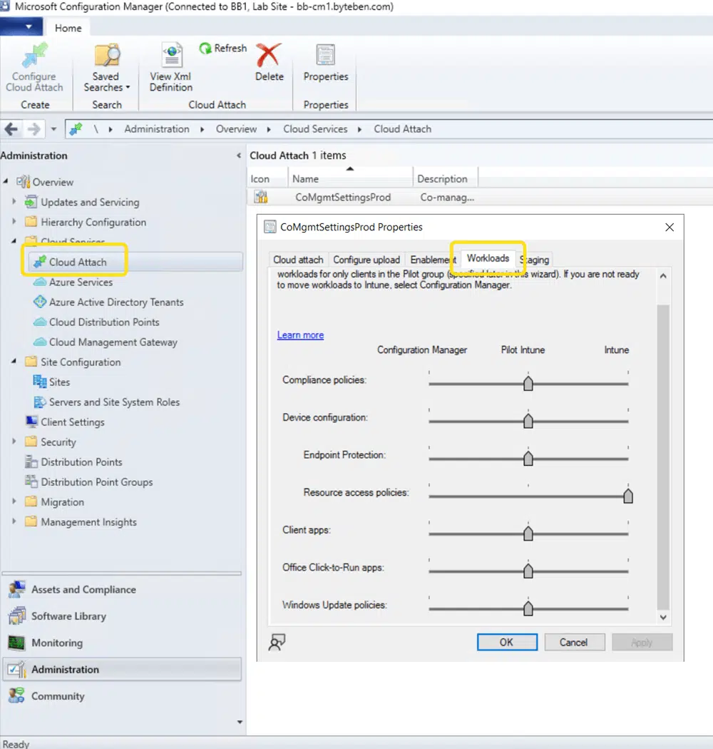 Workloads is a concept that allows us to move individual “workloads” from Configuration Manager to Intune. You can find the co-management settings in the Configuration Manager console under the Administration > Cloud Services > Cloud Attach node and on the Workloads tab.