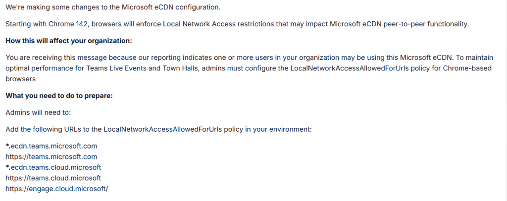 When Teams needs to communicate with local services for media handling or device access, it now crosses the same boundary. Without a Local Access Network allowlist, that communication can be blocked or interrupted. OneDrive applies LocalNetworkAccessAllowedForUrls automatically to avoid disruption. Teams does not. Microsoft documents the change and expects administrators to configure the policy themselves.