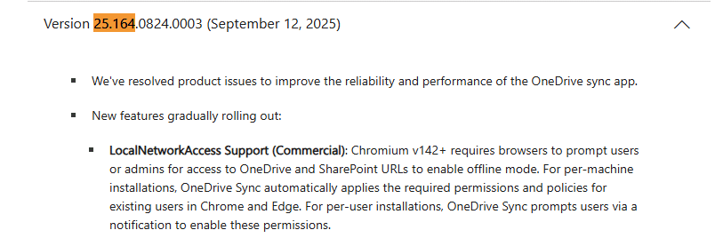 Microsoft confirms this behavior in the Edge known issues documentation. The OneDrive Sync Client was updated specifically to support the new Local Network Access behavior, and as part of that update, it applies the required registry values as a one-time mitigation.