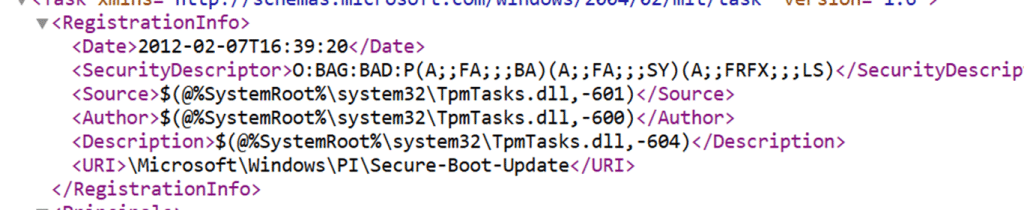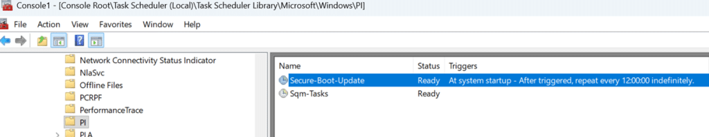 With the obvious agents not the ones fetching the secure boot status report data, it was time to move on. One thing is obvious… If Secure Boot state is being evaluated correctly and consistently reported, then the component responsible for Secure Boot Servicing itself must be involved. That realization leads directly to the PI Secure-Boot-Update scheduled task. (which is executed every 12 hours)