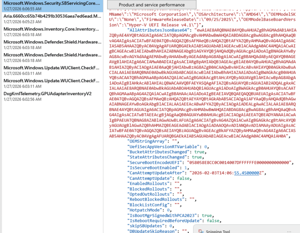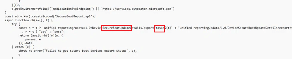 If the secure-boot-status task has gathered all required secure boot info, it will initiate the servicing flow to prepare the data for reporting. That diagnostic data payload is then sent using SBServicingCoreTelemetryProvider::SendSecureBootInfo. The data is not sent to Intune, and it is not sent to Autopatch directly. It is emitted as Windows Secure Boot servicing telemetry/diagnostic data and flows through the Windows Update servicing pipeline into Windows Update for Business reporting.