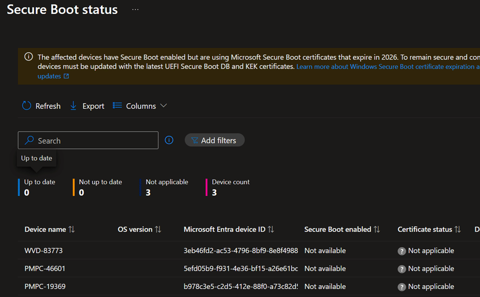 Not only because something could have gone wrong (policy rejected by licensing), but also because it finally promises visibility. It shows all the Secure Boot Info you need. The Secure Boot report indicates whether systems are considered ready, and provides a sense of Secure Boot Certificate update progress without touching individual machines.