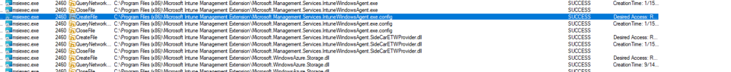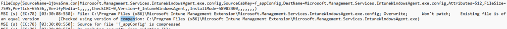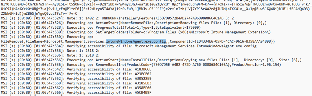 Once that happened, the intunewindowsagent.exe.config file was gone. The new MSI no longer treated the missing config as the key proof that the component was broken in the same way the older package had