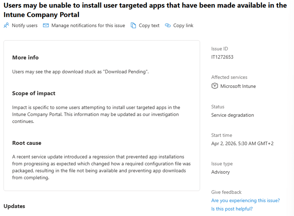 The second chapter began when Microsoft tried to solve that original config problem. What changed in 1.101.103.0 was not just a version bump. Microsoft changed how MSI handled Microsoft.Management.Services.IntuneWindowsAgent.exe.config, and that change appears to explain why the file might have disappeared during the first upgrade to the new companion model. Microsoft later acknowledged the fallout under IT1272653, describing a case where user-targeted apps could remain stuck in Download Pending because a required configuration file had become unavailable.