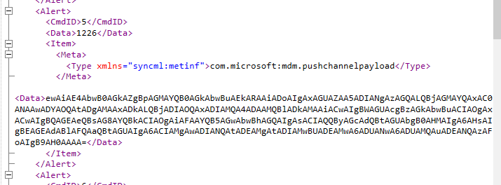 As discussed in our previous blog, discussing the 8-hour Intune sync maintenance myth, the push payload is not a policy update, nor does it contain any other policy information. It just is a small base64 encoded JSON structure containing a notification identifier, a version number, and minimal metadata. It carries no CSP data and no commands.