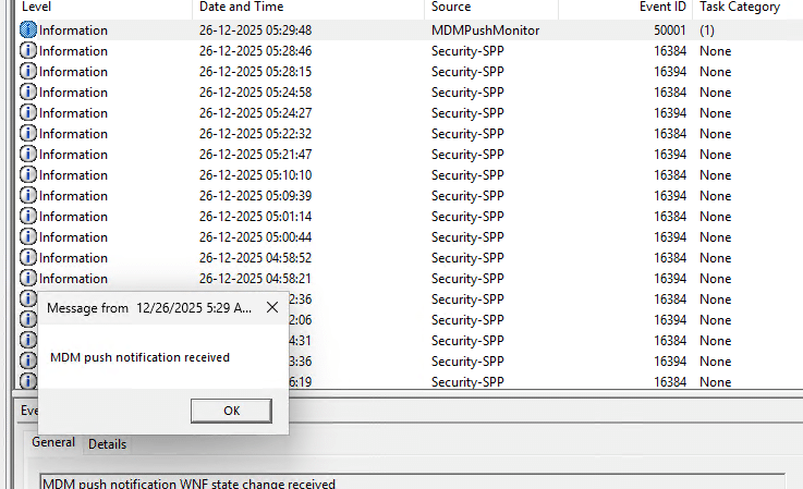 That queued scheduling for queued alerts seems to exist to protect the system. It allows Windows to throttle push notification processing but adds a 5-minute delay before the device starts syncing. This is exactly why a remote Intune sync feels like nothing happened on the device.