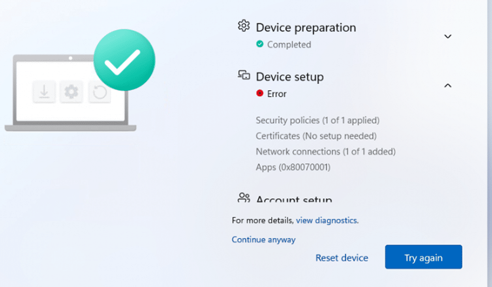 Hours would pass, and nothing would change, no errors, logs, or hints of what was going wrong. It was like the apps were trapped in some sort of installation purgatory. And then, to make things even stranger, Autopilot enrollments also began breaking. Devices would go through the standard enrollment phases, but once they hit the “install required apps” step, the whole process would grind to a halt. With the process being stuck, you will run into the Windows Autopilot issue: 0x80070001 error.