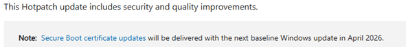 The same March 2026 hotpatch article also contains another detail that should make people slow down a bit. Microsoft explicitly says that Secure Boot certificate updates will be delivered with the next baseline Windows update in April 2026, NOT with the hotpatch month itself.