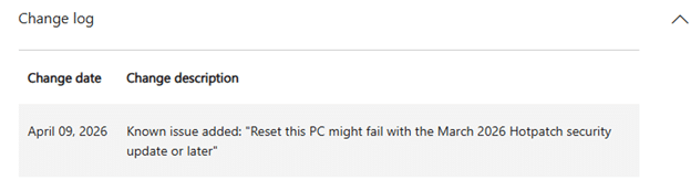 In the March 10, 2026 hotpatch article for KB5079420, Microsoft states that Windows Autopatch managed commercial devices with hotpatch enabled can fail during Push Button Reset.