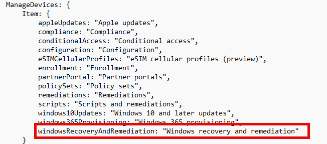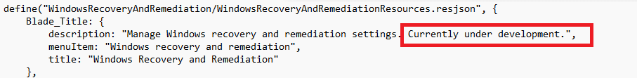 While digging through the Intune Portal React views, something new appeared. A feature named: Windows Recovery and Remediation. Inside it was a resource file called WindowsRecoveryAndRemediationResources, and the description mentioned: “Manage Windows recovery and remediation settings. Currently under development.”