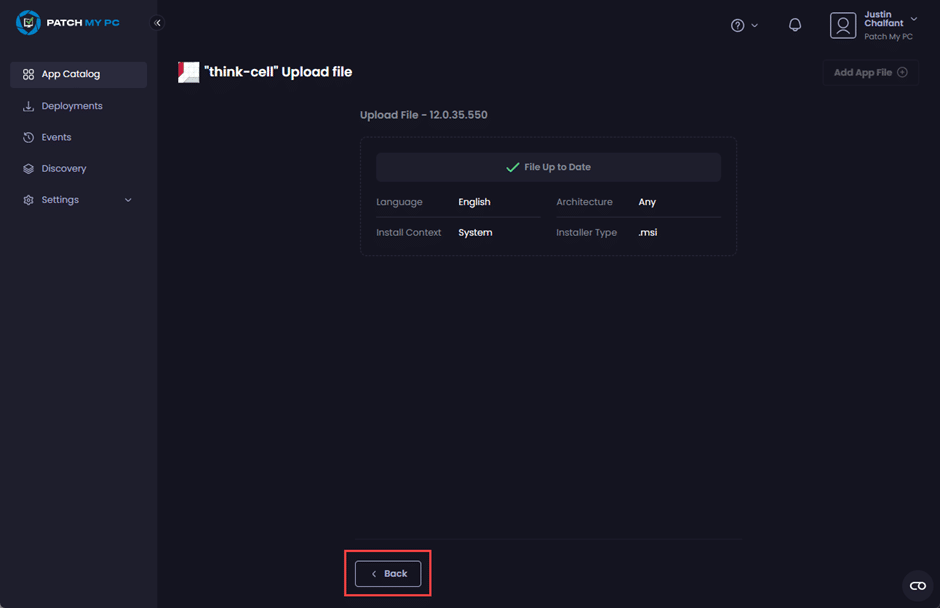 If you still have the “<app_name>” Upload file screen open, click Back, otherwise search for the app in the App Catalog and click it to open its properties screen.