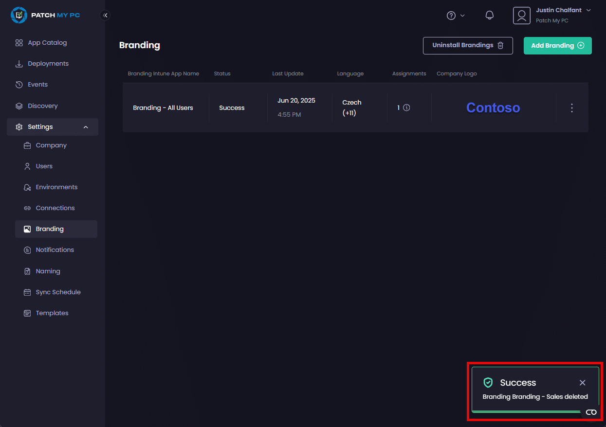 The Branding screen is redisplayed showing the Branding App has been deleted.