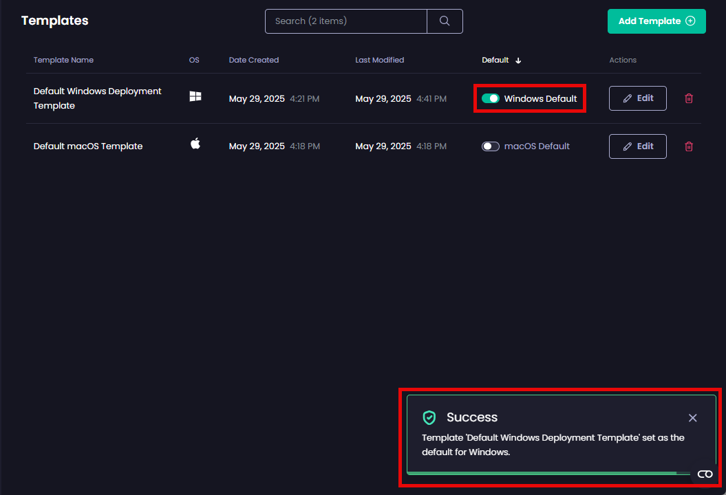 The Templates page is redisplayed, showing that the selected template is now the default template for all new deployments created for the relevant OS platform, along with the Success – Template “<template_name>” successfully set as the default for <platform> notification.