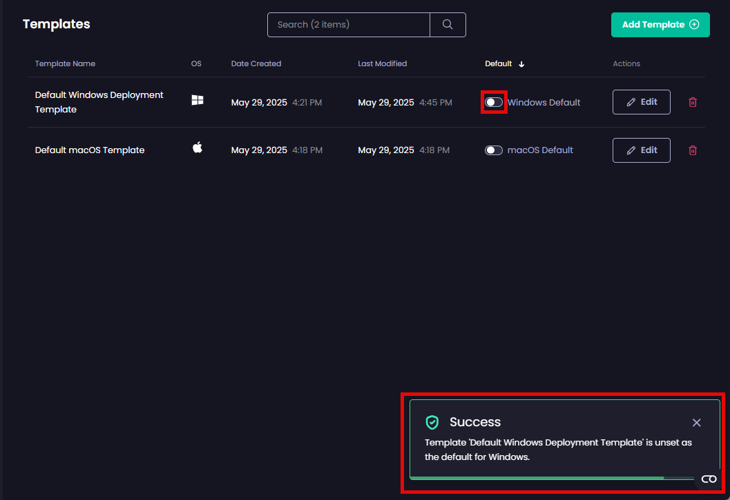 - On the Templates page, click the relevant slider under the Default column beside the template you want to configure as the default for all deployments created for that OS platform going forward.