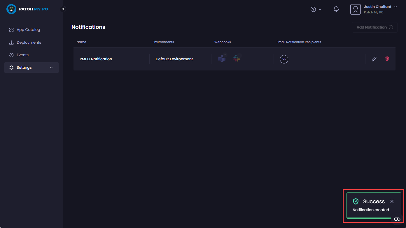 The Success – Notification created notification is shown.