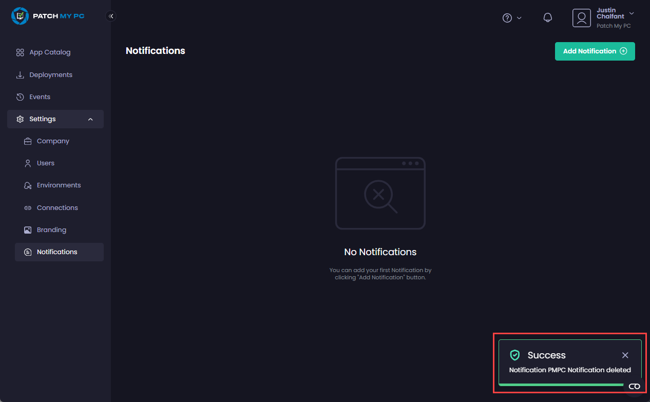 To delete a notification in Patch My PC (PMPC) Cloud:
