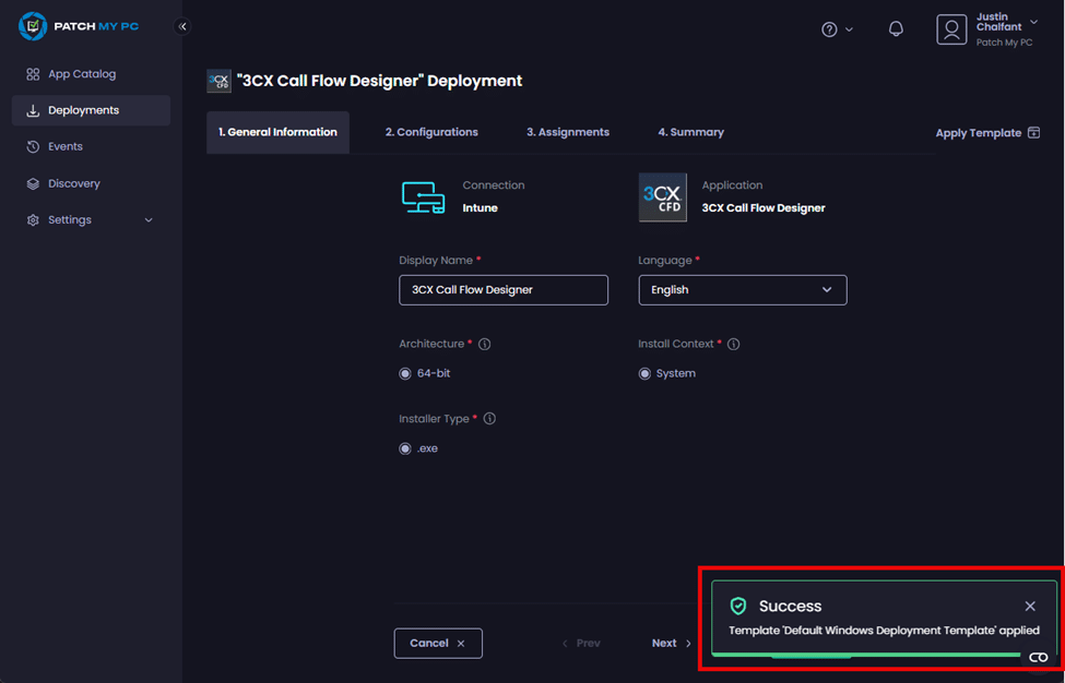 Once the Deployment Templates (Templates) feature of Patch My PC (PMPC) Cloud has been enabled for your PMPC Cloud company and you have created at least one template, you can start using templates for your new deployments.