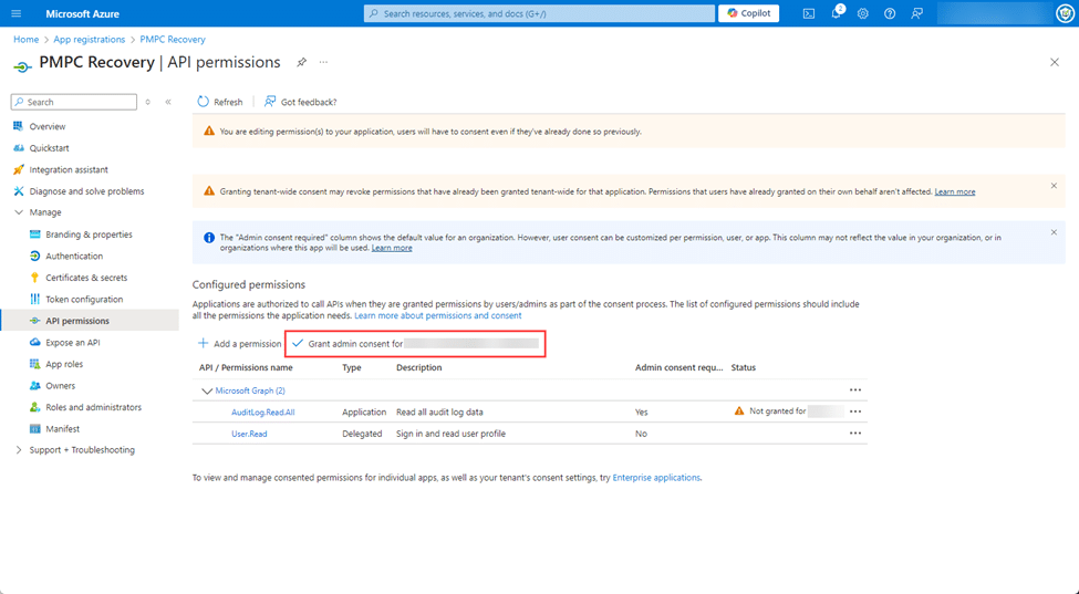 On the API permissions screen, under the Configured permissions section, click Grant admin consent for <your_tenant_name>.