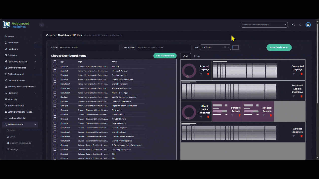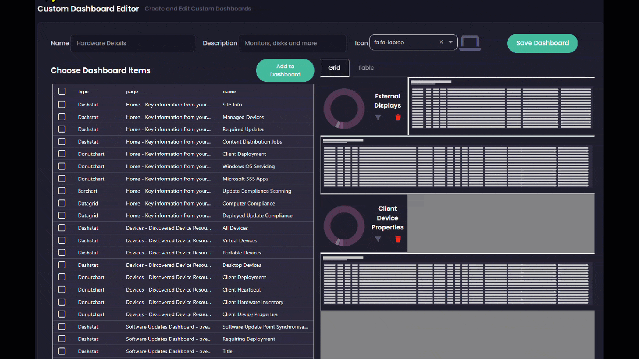 To add new items to the dashboard, select them from the list and click ‘Add to Dashboard’.