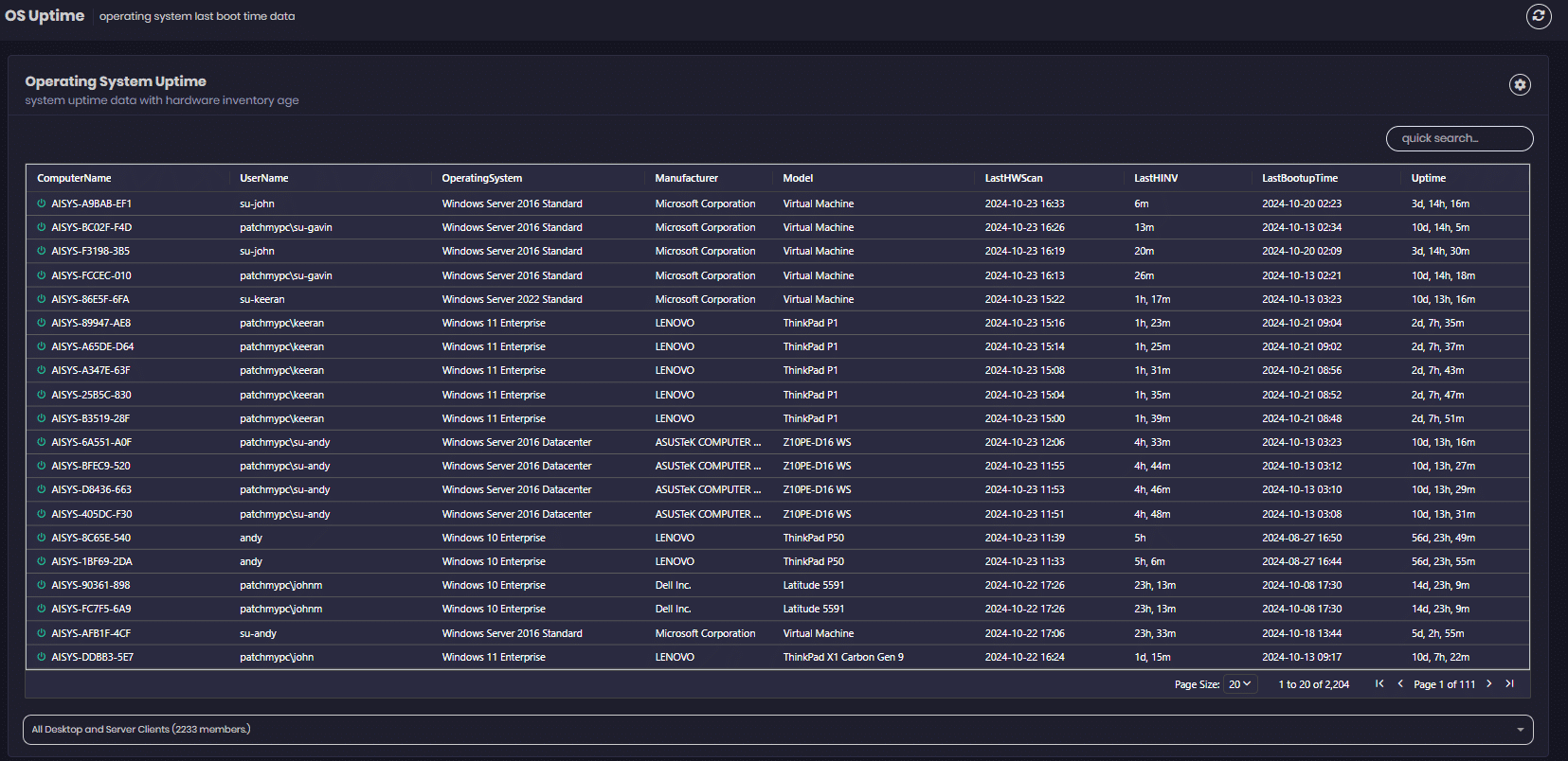 This dashboard displays the Windows OS Uptime data and when the last hardware inventory occured from the device clients.