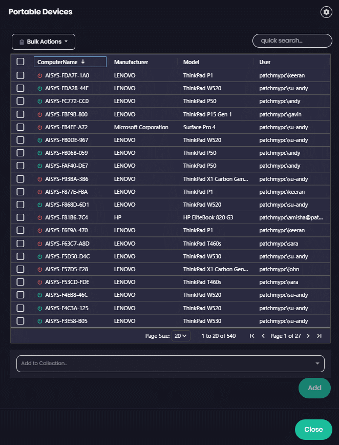 At the bottom of the table page you can also make the page size large in rows and also by selecting a device or multi devices add them into a collection.